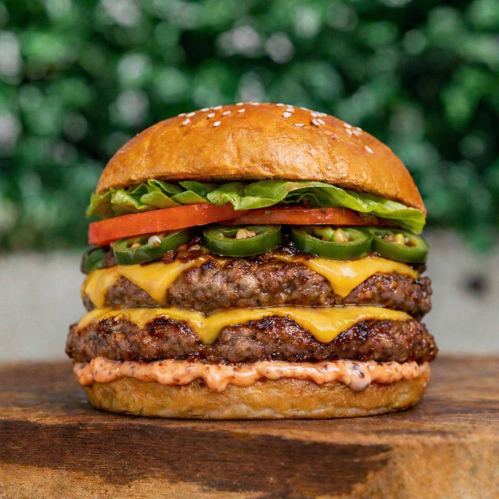 Doppeltes Beef Patty, geschmolzener Cheddar und Jalapeños mit unserer hausgemachten Harissa-Soße.