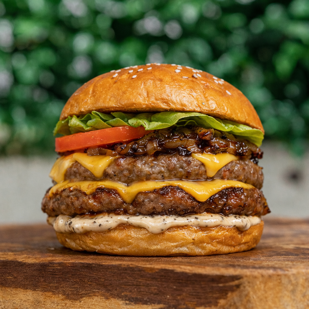 Doppeltes Beef Patty mit Cheddar, karamellisierten Zwiebeln und Trüffel-Mayo.